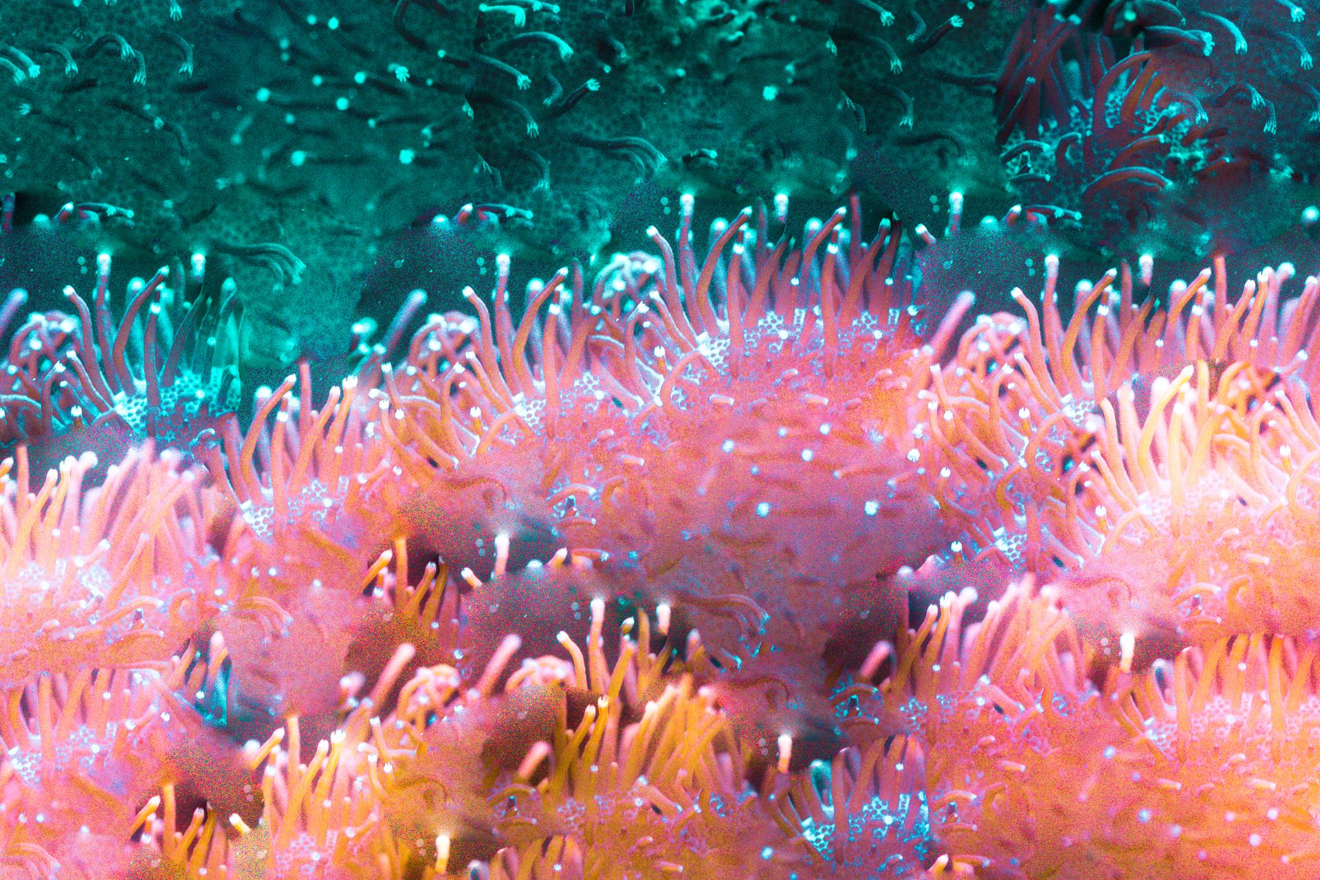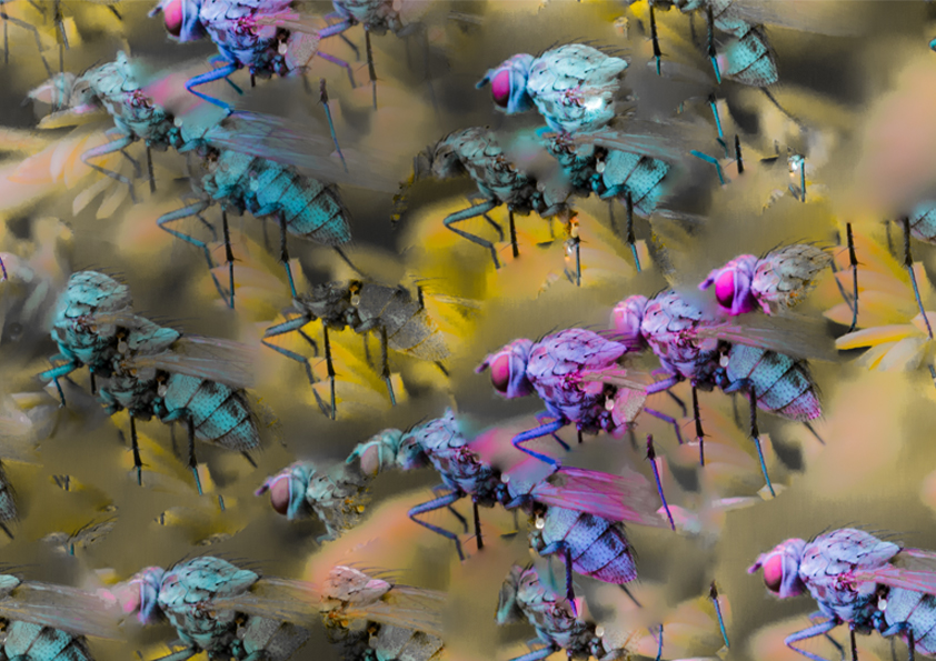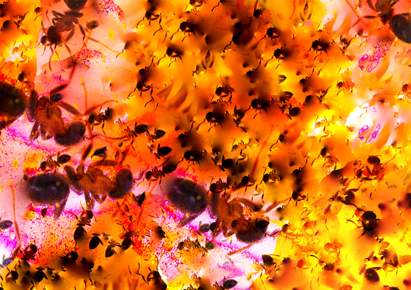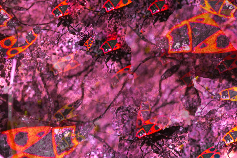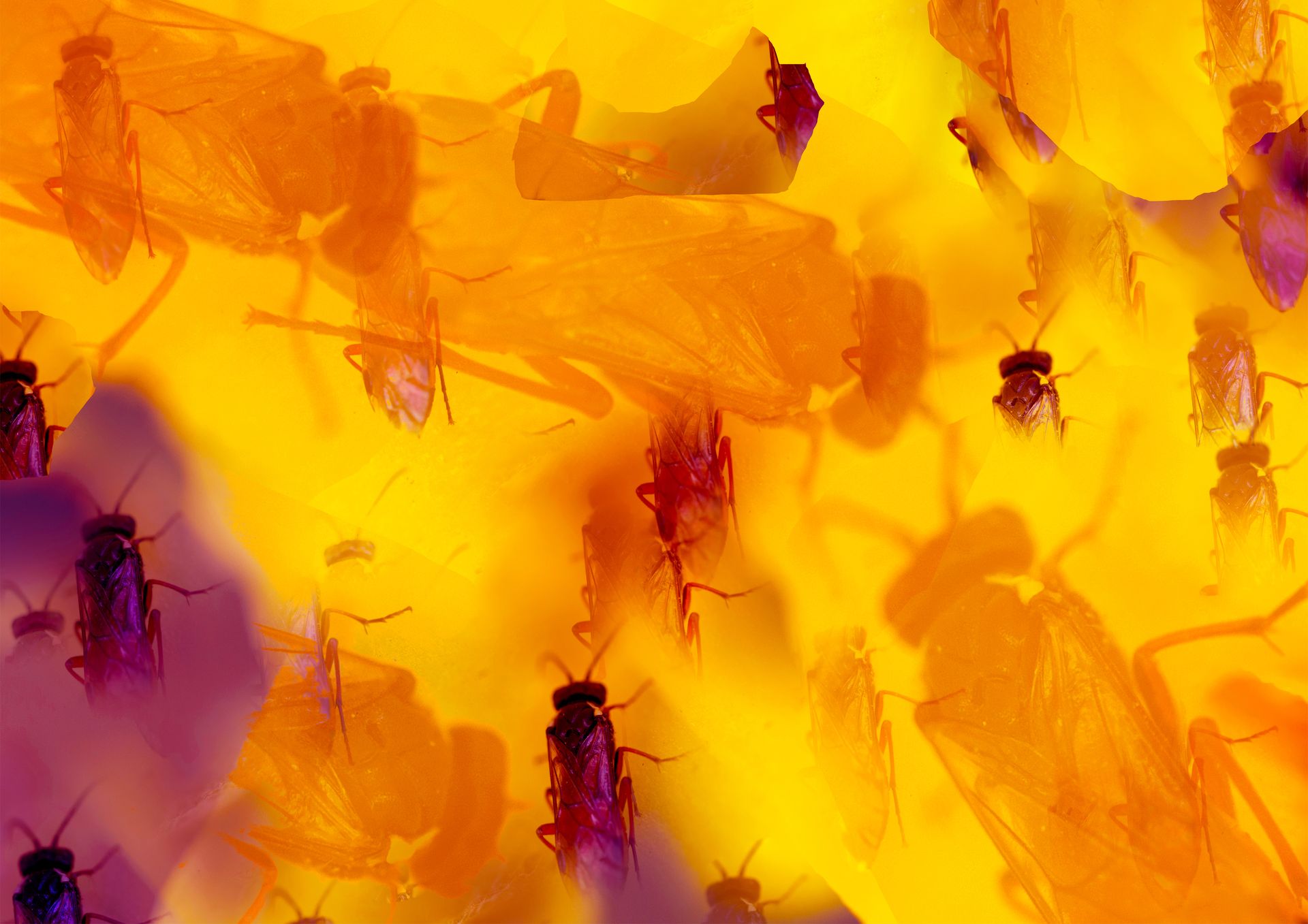 A macro look at the living world suggests a kaleidoscopic movement through bright, vibrant hues. Insect and plant forms are both activated and fossilized within a fluid color spectrum and transparencie.