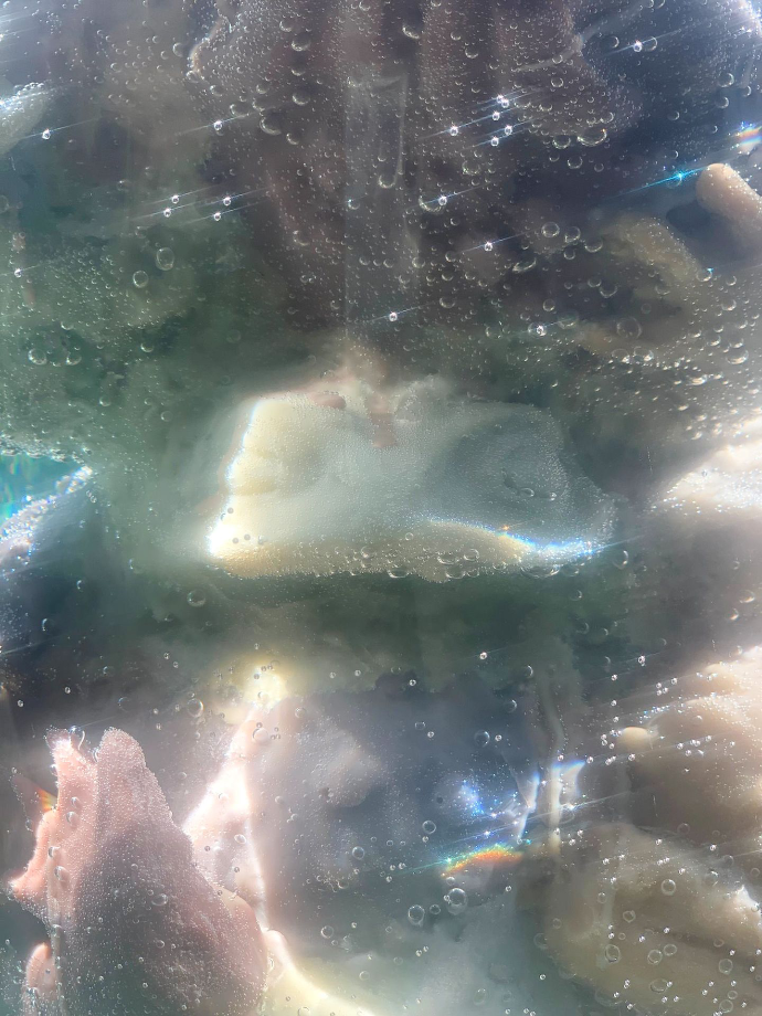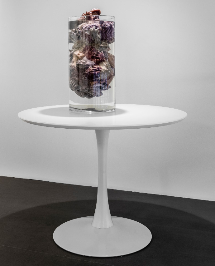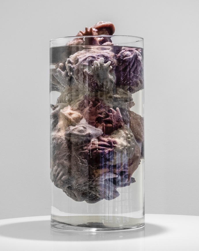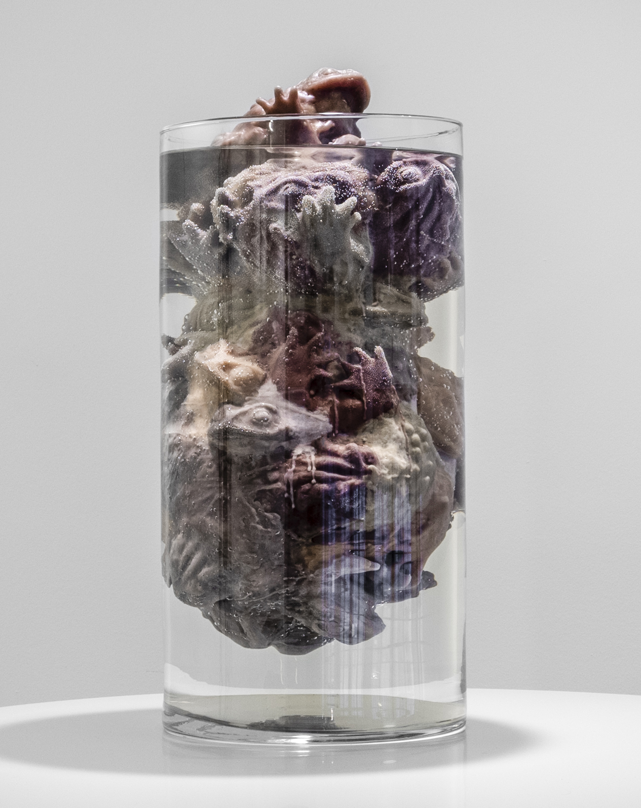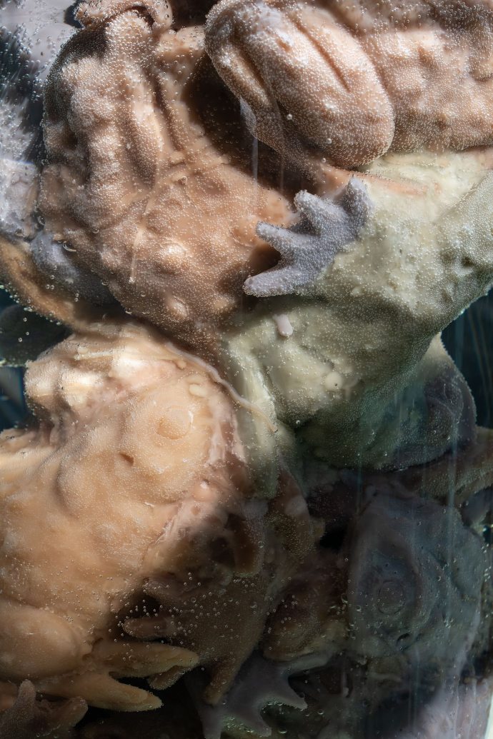 Dominio dei rospi echoes the experience of encounters with toads during their reproduction by exploring new approaches and techniques. The toads are duplicated in paraffin, a petroleum derivative, from an identical mold, and are then reassembled and fused to create a single hydrophobic entity. The round glass invites the viewer to approach, move, and explore the sculpture in a circular movement. At the same time, the sculpture questions our way of perceiving the individual versus the collective, as well as how we perceive the Other, prompting us to doubt what we see. Although each toad originates from the same negative mold, the resulting structure is unique, a new system forged by the interplay of diverse forces. What appears identical becomes singular, challenging the very structure of repetition, form, and identity.
