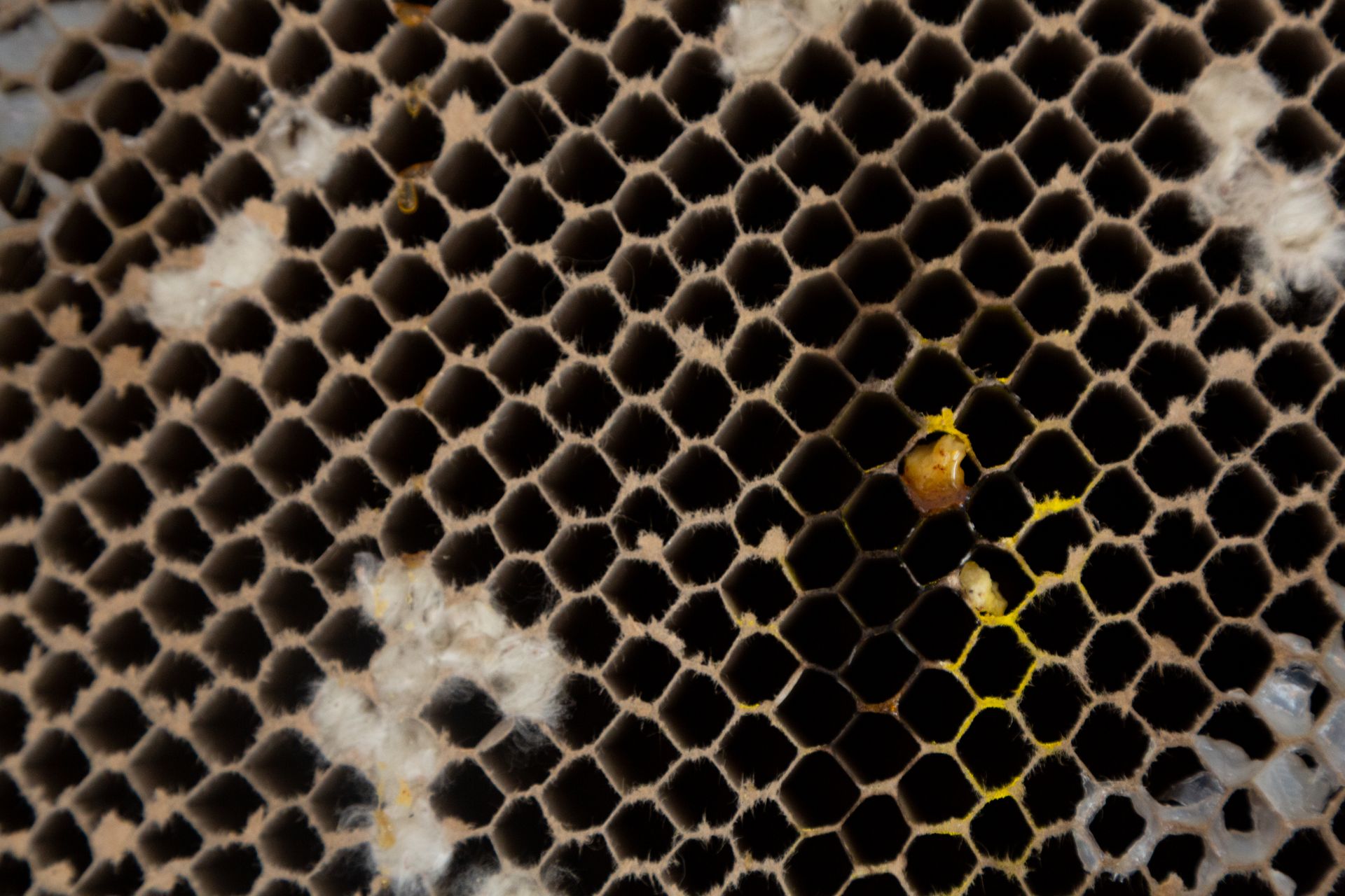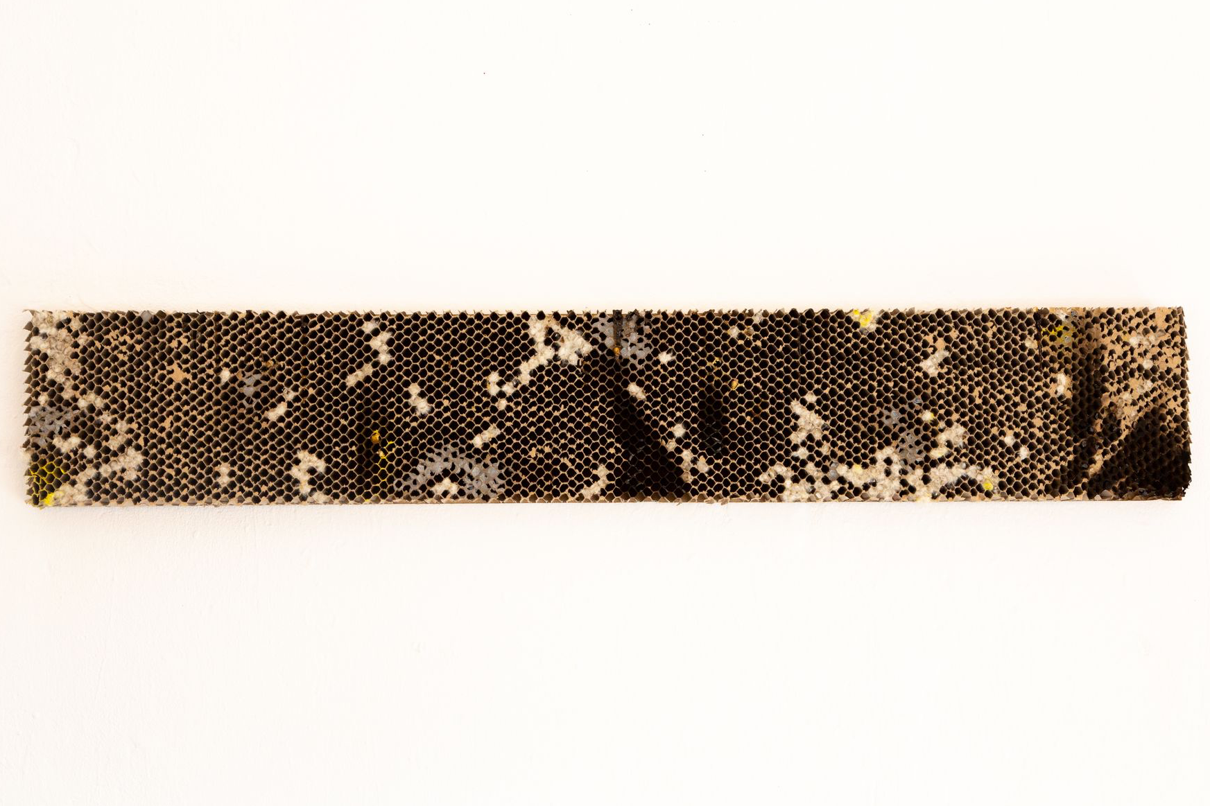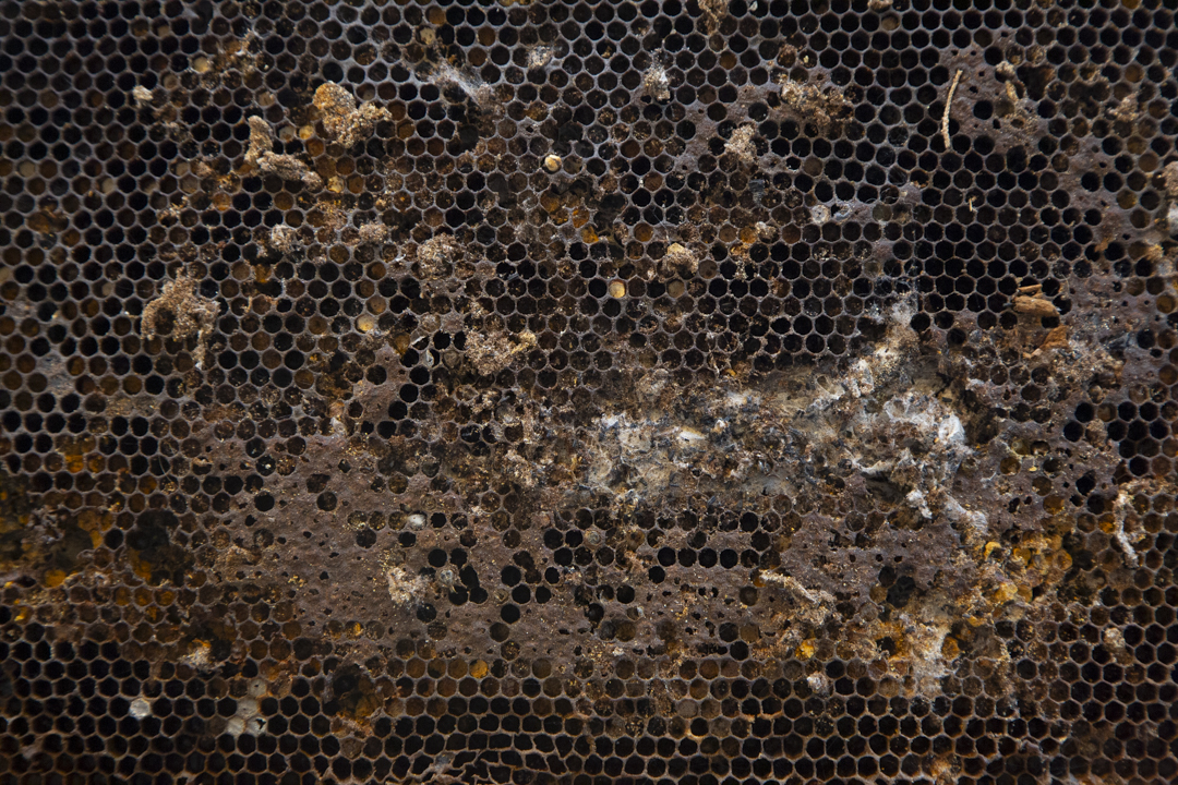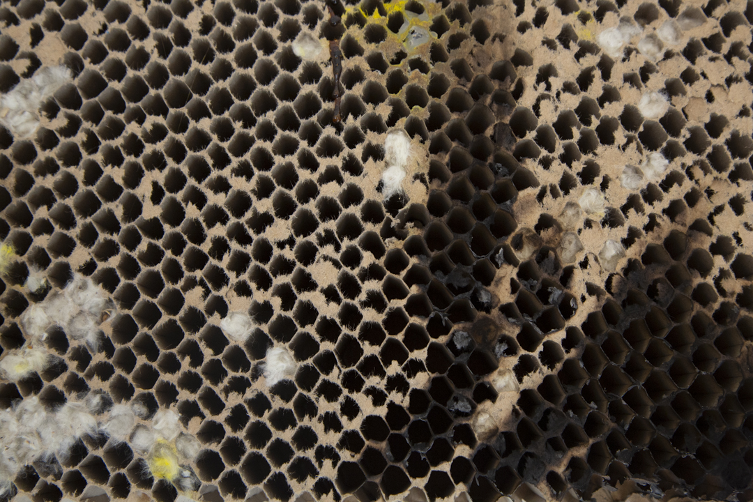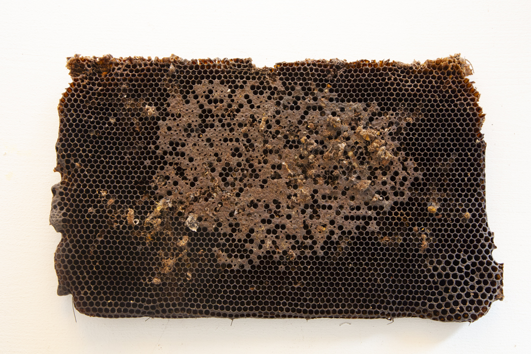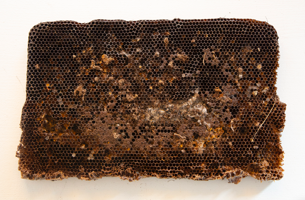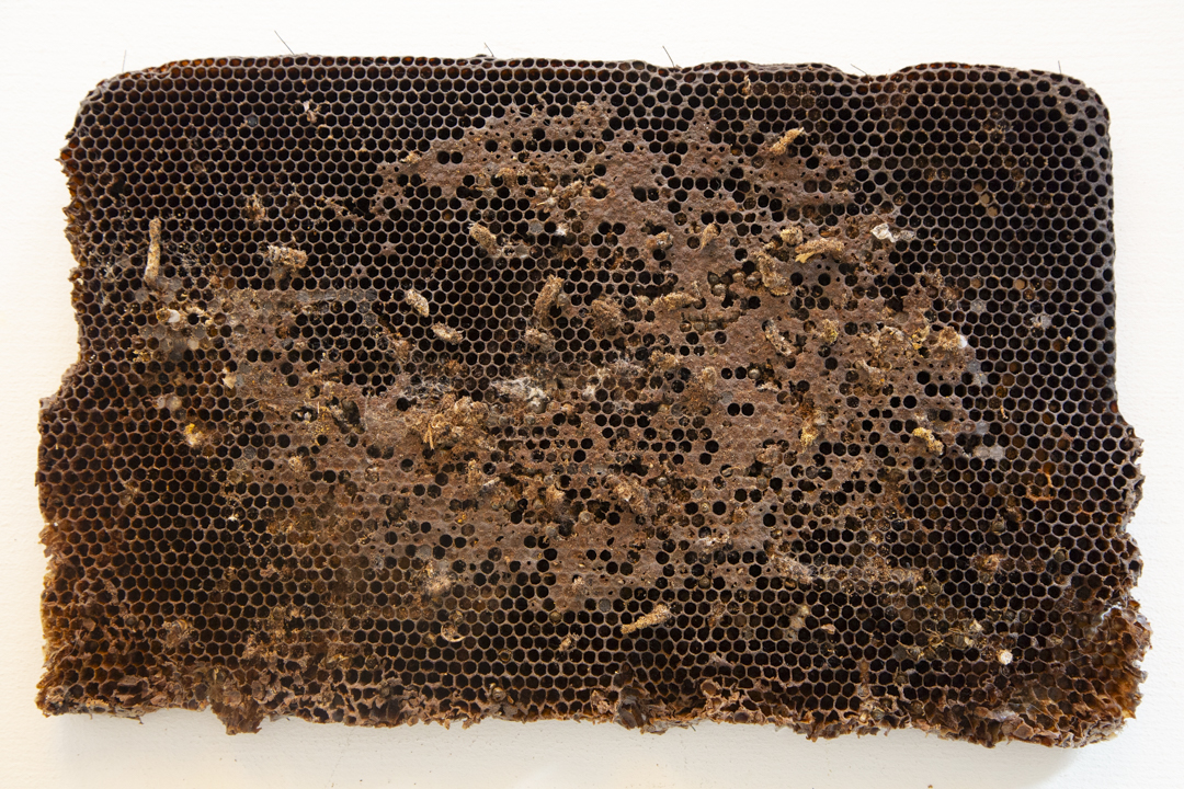 L'epoca d'oro delle api è terminata is a reproduction of what I was able to observe and study. The structure of the work is inspired by cloths recovered from inside beehives abandoned at the end of the honey harvest season. These fragments bear the marks of the bees’ former labor; however, what struck me most was seeing how new life had already begun to inhabit these emptied spaces. Small spiders, insect larvae, and other organisms had started to occupy what was once a highly organized system. This transformation, like an abandoned house becoming a home for others, shaped my approach. The diversity of materials and textures in the work reflects this layered process; a shift from one form of life to many, from a unified purpose to spontaneous adaptation. The title also alludes to the broader crisis bees are currently facing, increasingly exploited and displaced by human practices, their decline signals an imbalance in the natural order.Rather than mourning the end of a cycle, the installation captures what follows; not absence, but quiet continuation; not decay, but transition.