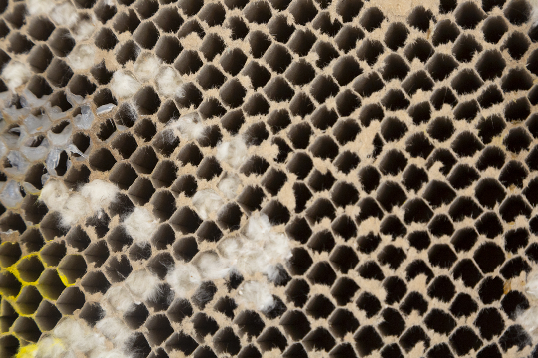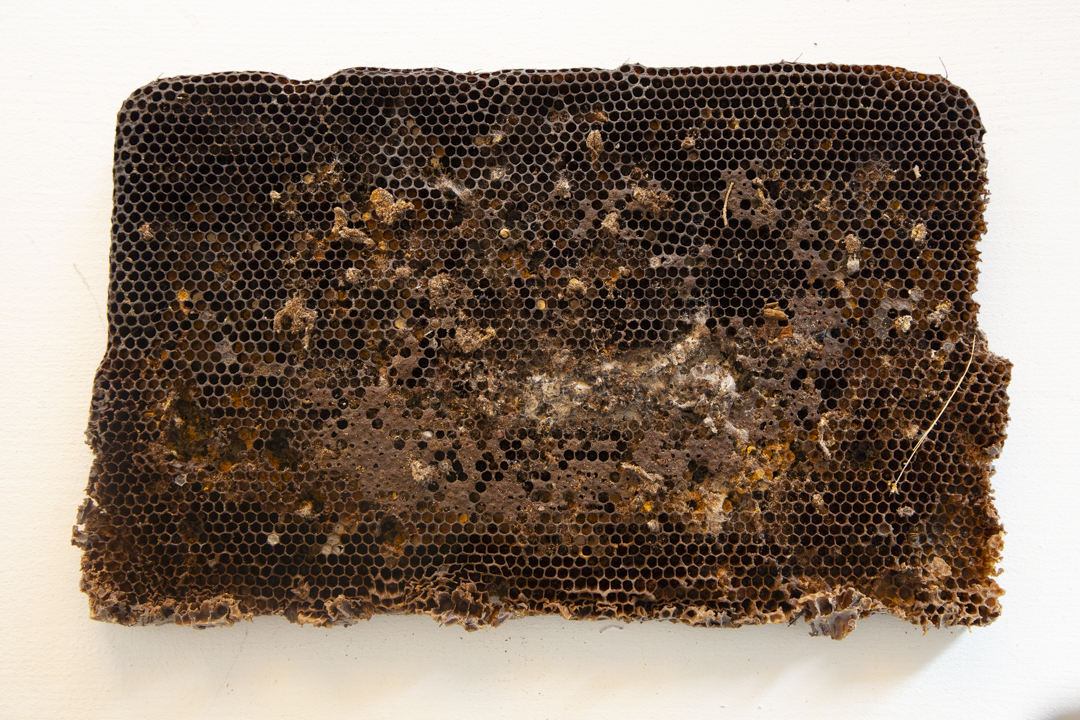 L'epoca d'oro delle api è terminata is a reproduction of what I was able to observe and study. The structure of the work is inspired by cloths recovered from inside beehives abandoned at the end of the honey harvest season. These fragments bear the marks of the bees’ former labor; however, what struck me most was seeing how new life had already begun to inhabit these emptied spaces. Small spiders, insect larvae, and other organisms had started to occupy what was once a highly organized system. This transformation, like an abandoned house becoming a home for others, shaped my approach. The diversity of materials and textures in the work reflects this layered process; a shift from one form of life to many, from a unified purpose to spontaneous adaptation. The title also alludes to the broader crisis bees are currently facing, increasingly exploited and displaced by human practices, their decline signals an imbalance in the natural order. Rather than mourning the end of a cycle, the installation captures what follows; not absence, but quiet continuation; not decay, but transition.
