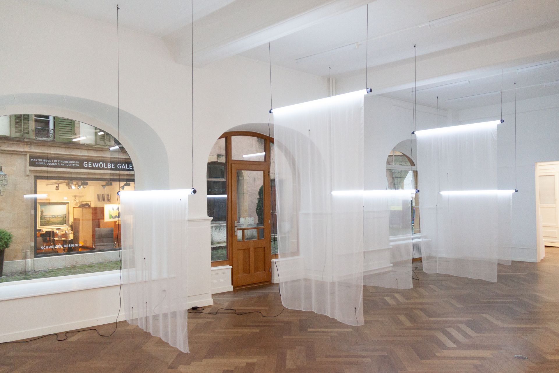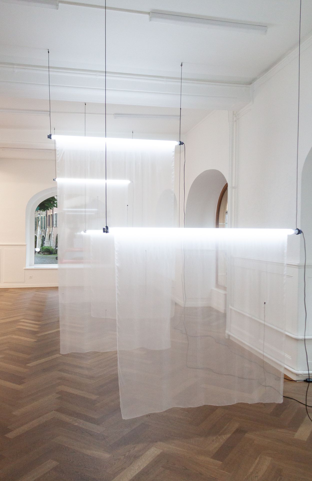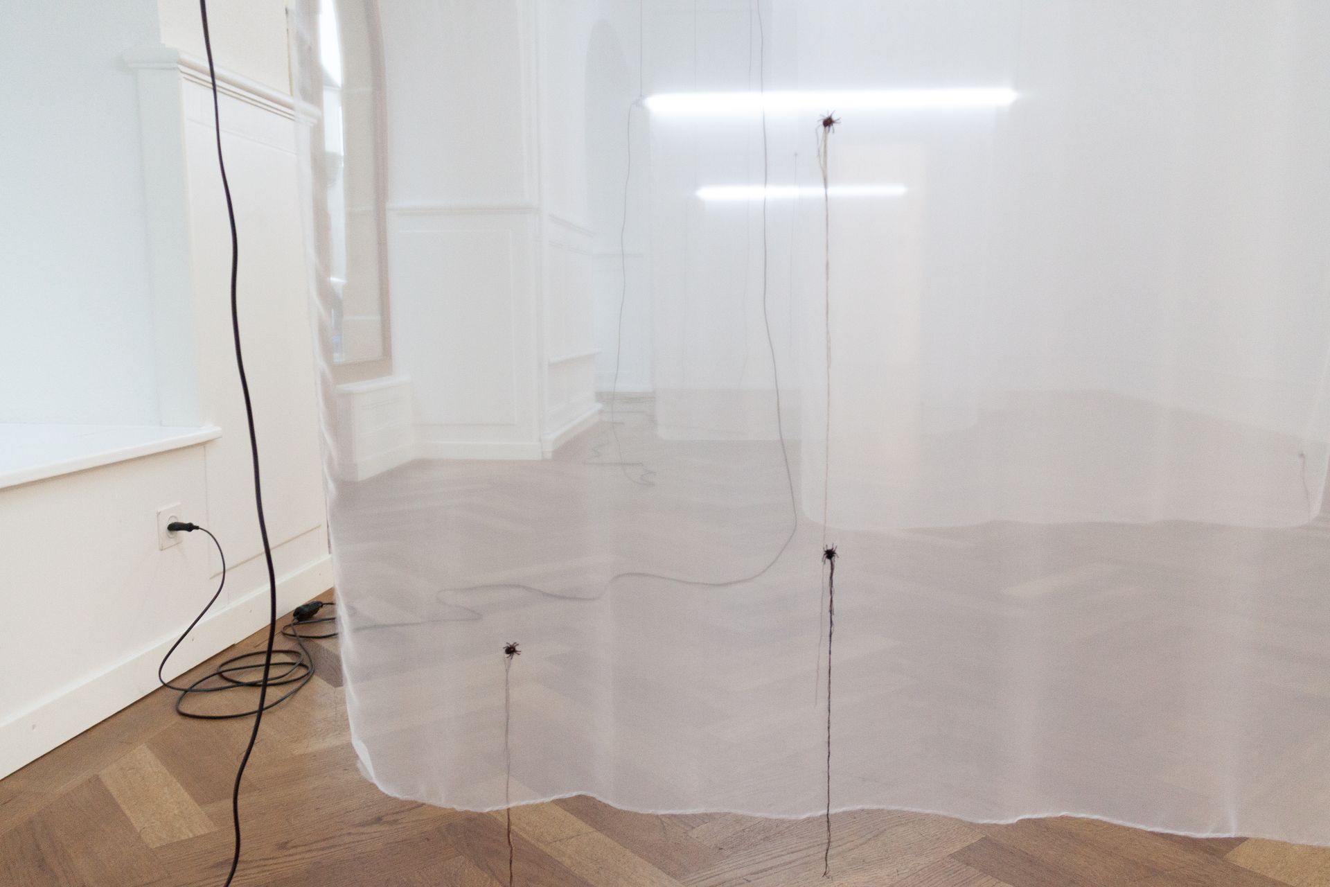 Embroidery on silk, LED lights, cables and electricity
