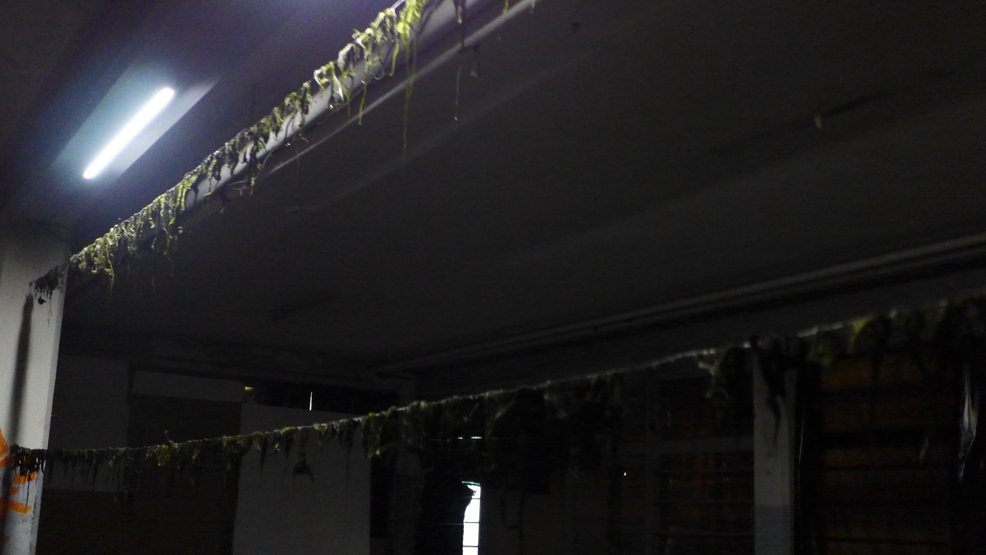 STAGNO creates a space where the wild and the domestic mix, forming a unique, shifting environment. Moist Spirogyra algae are arranged along three iron wires. As the algae release drops onto four sensors on the ground, these sensors pick up the vibrations and play the sound through two speakers aligned with the algae.