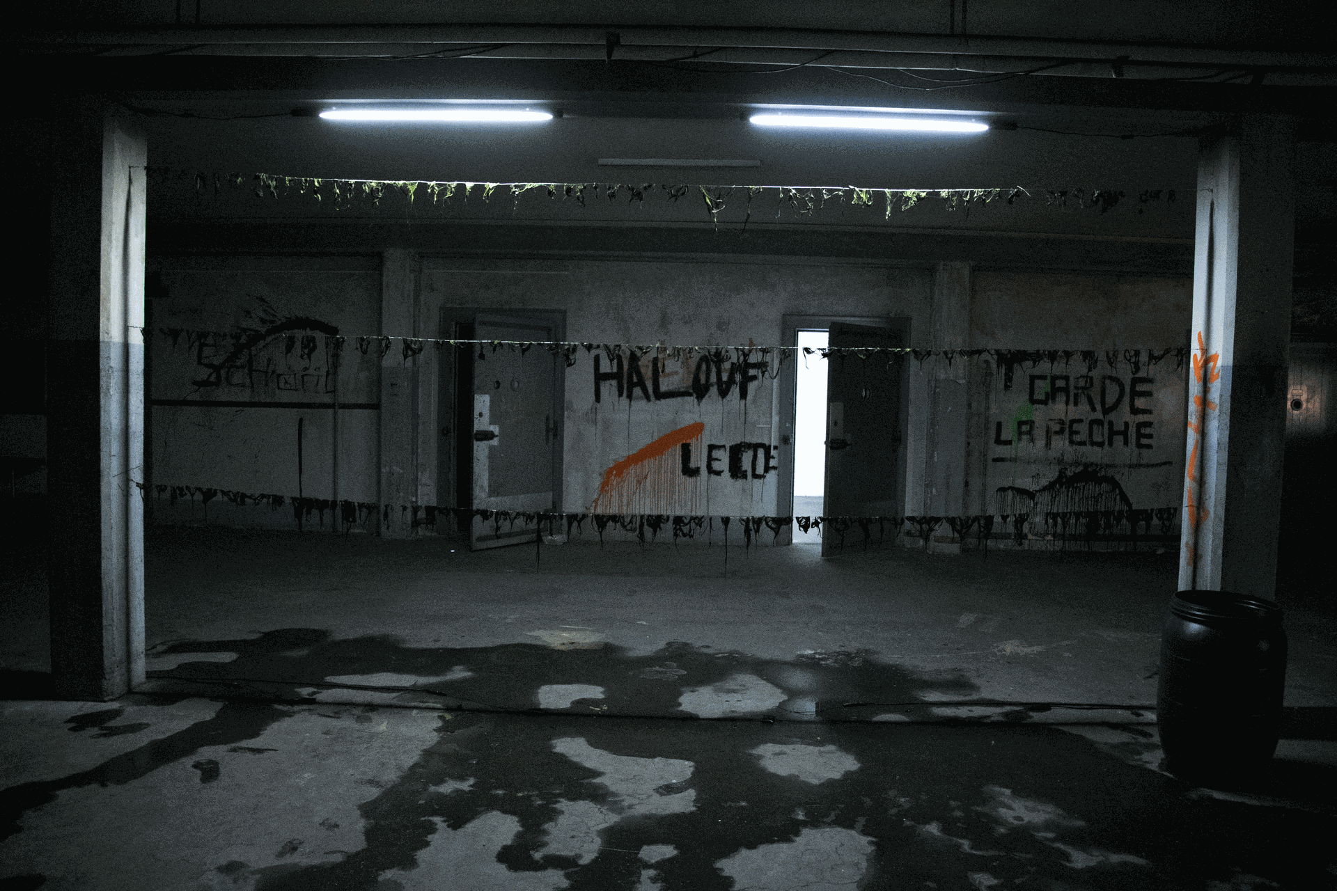 The drying algae and rusting iron show the passage of time, marked by the sound eventually stopping. This temporary installation contrasts with the two videos displayed in separate rooms. While the installation in the center feels familiar and connected to our sense of time and space, the videos create a loop that isolates the viewer in endless time. This shift in scale either brings us closer to the world around us or makes us feel more distant from it, highlighting the limits of human perception.
